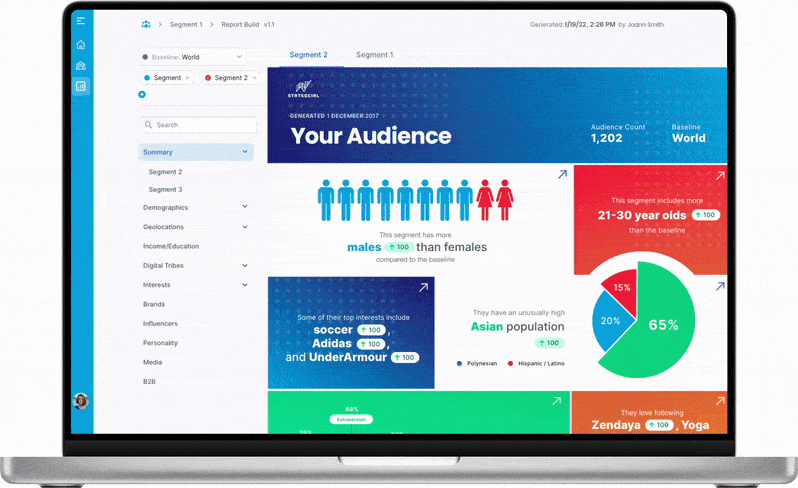 Our platform gives you access to millions of verified consumers via their publicly declared social data. In layman’s terms? You get a holistic view of your audience based on the information they share about themselves across social channels including their unique: