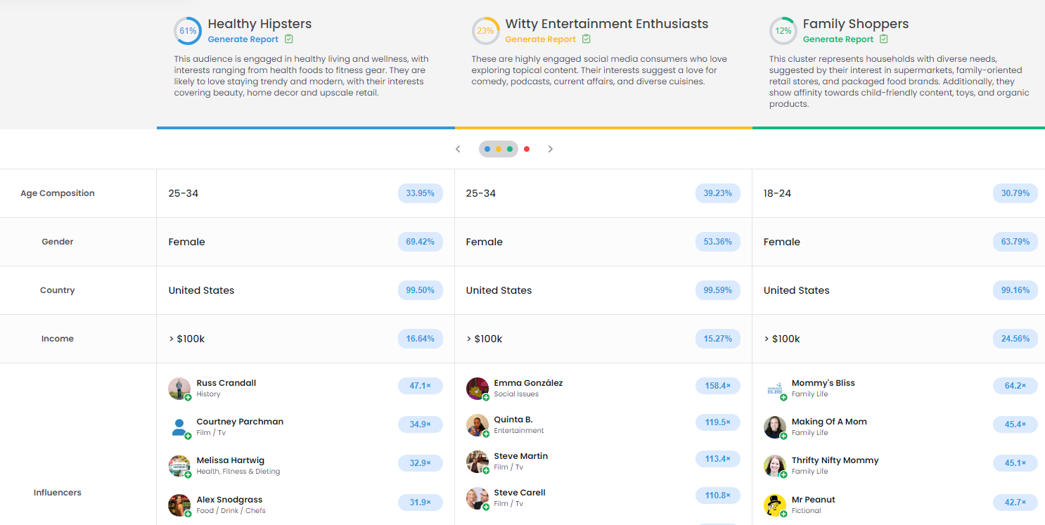 LaCroix’s audience is made up of 4 different buyer personas, the vast majority being “Healthy Hipsters.” We can look into each persona, and view their unique attributes including how to best reach them based on their specific influencer and media preferences. LaCroix could even build a single report on any of these personas, with a click of a button, for a more extensive deep dive.