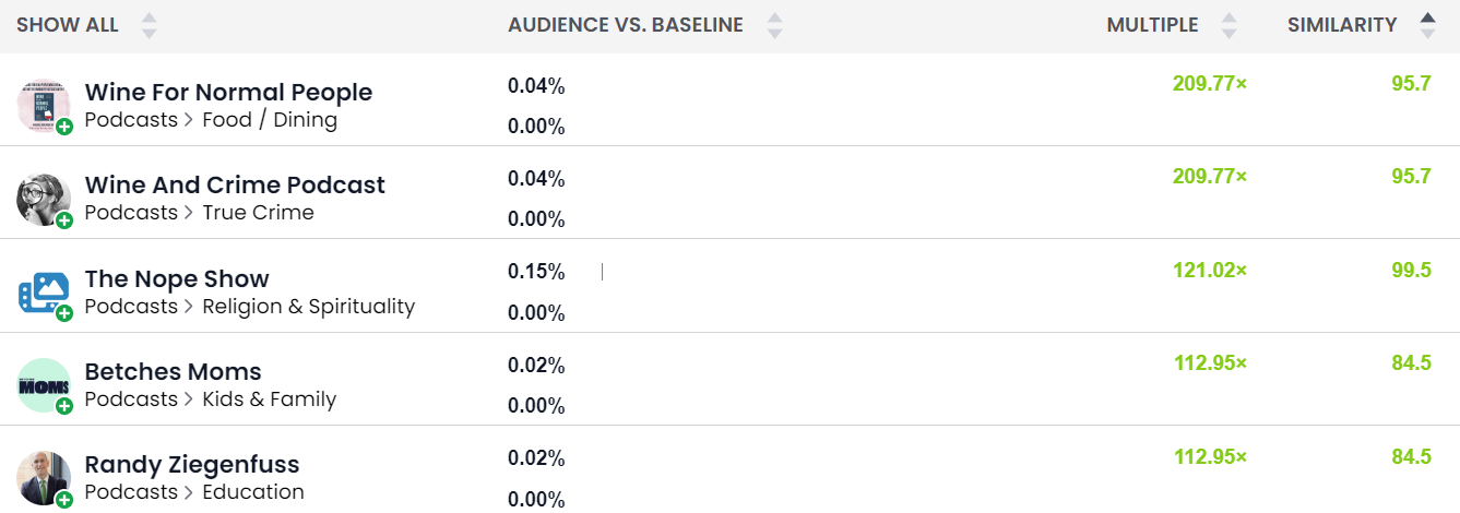 Understanding your audience’s preferred media channels is key to reaching them effectively. With StatSocial, you can explore any audience’s favorite podcasts, streaming services, magazines, and more to build a comprehensive and data-driven media plan. LaCroix can even view which channels their audience spends more time (e.g. podcasts over streaming services) to inform future ad placements and budget allocation.