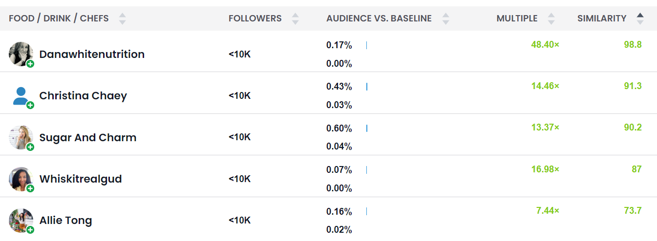 Where most influencer marketing tools surface influencer recommendations based on vanity metrics, StatSocial can surface nano to celebrity influencers based on who an audience engages with. For LaCroix, we wanted to uncover the top 5 nano food influencers that their audience engages with most, given more than half their audience falls under the “Healthy Hipsters” persona.