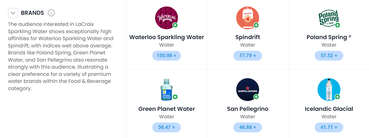 Within StatSocial’s platform, it’s easy to identify other brands your audience has an affinity for, including your competitors. Knowing that LaCroix’s audience also enjoys popular brands like Spindrift and San Pellegrino is key to keeping tabs on the competition. And within StatSocial’s platform, you can even compare all 3 audiences in one view to see how they differ.