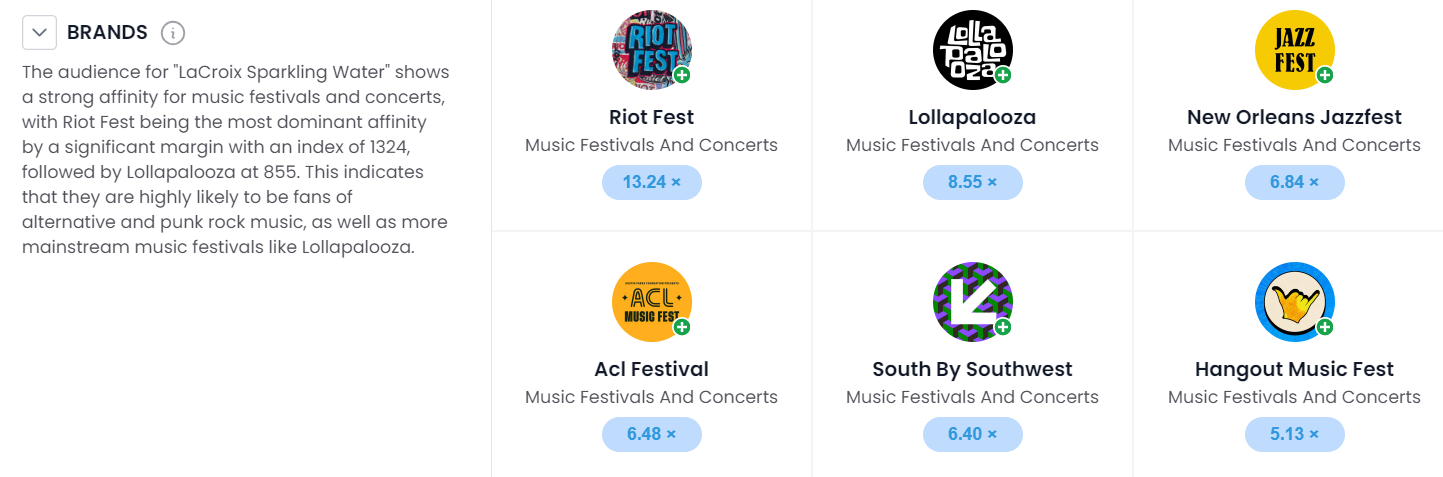 Additionally, LaCroix’s marketing team can identify brands outside their category for partnerships and collaborations. For example, LaCroix’s audience tends to be music festival goers over the general population. LaCroix could explore sponsorships at these events.