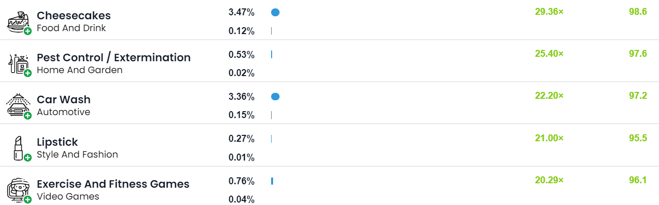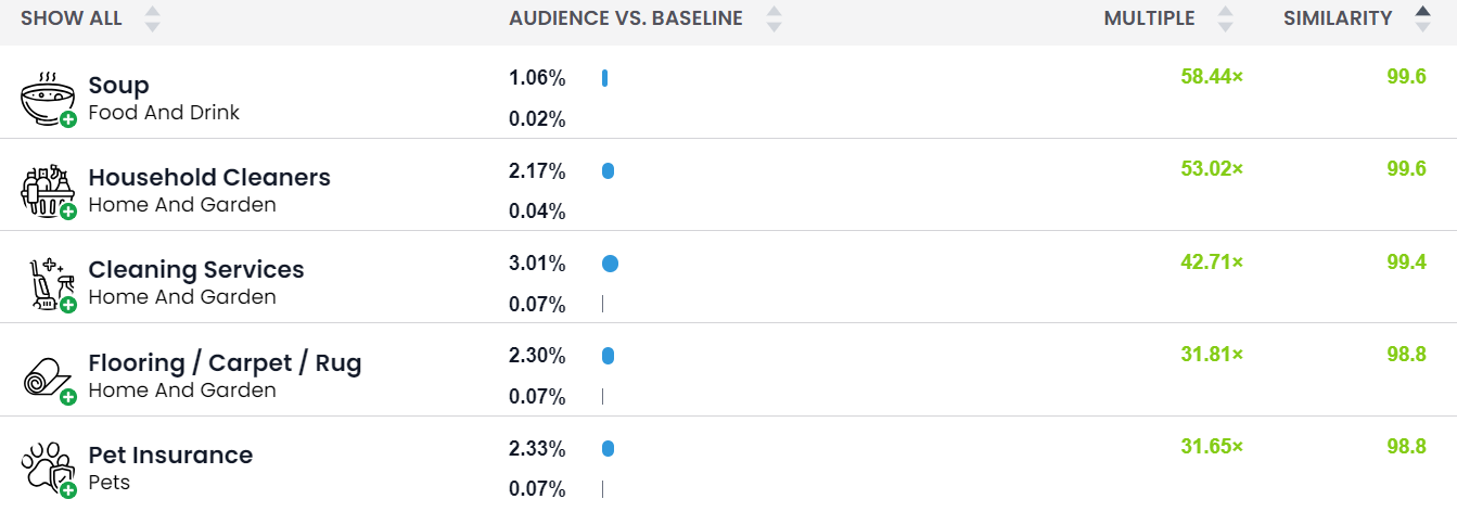 Interests are key to better understanding our audience and what drives them. The top 10 interests across LaCroix’s audiences center around cooking, cleaning, health, beauty and lifestyle. These insights indicate their audience is likely neat, health-conscious, and even pet friendly. All things LaCroix could work into their messaging strategy and future campaigns.
